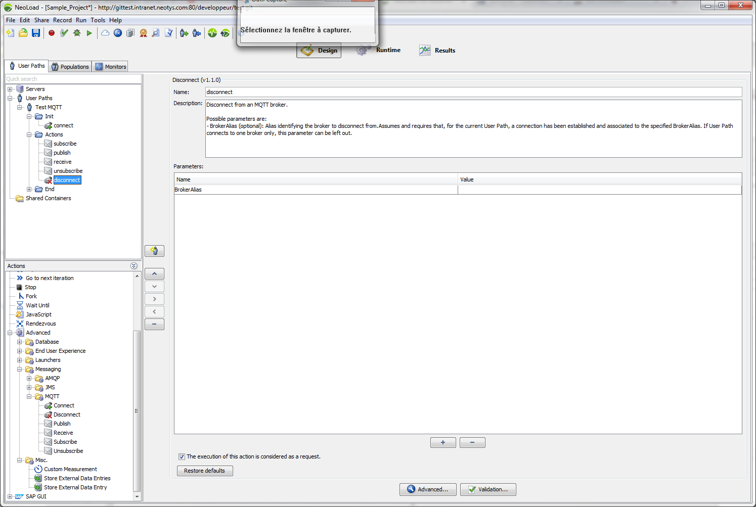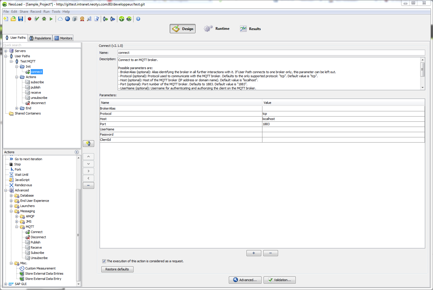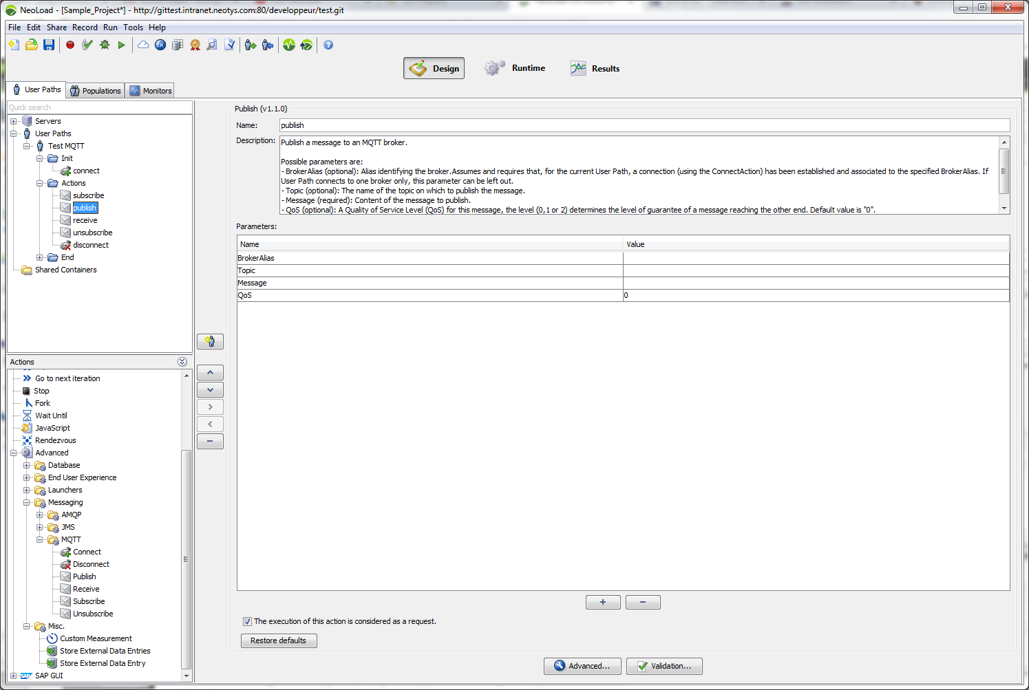 An example publishing on the ‘/neotys.com/share/news/’ topic using the connection associated to the ‘LocalDefaultBroker’ alias: