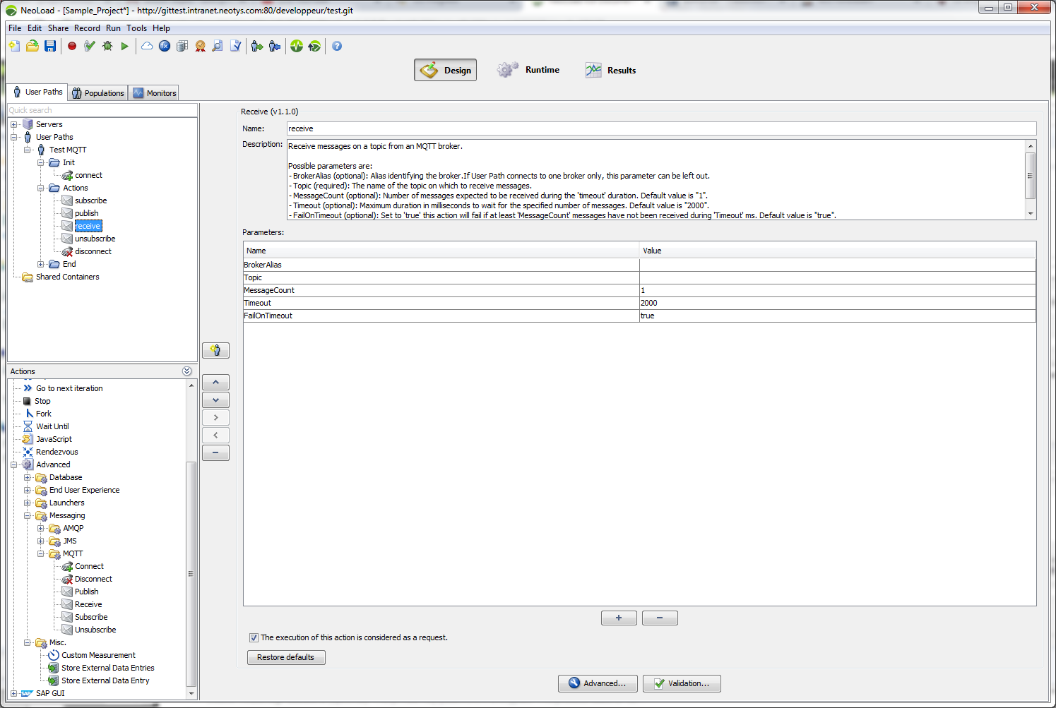 An example of receiving messages on the ‘/neotys.com/share/news/’ topic using the connection associated to the ‘LocalDefaultBroker’ alias and expecting to receive at least 10 messages in 30 seconds, if this contract is not met the action will fail: