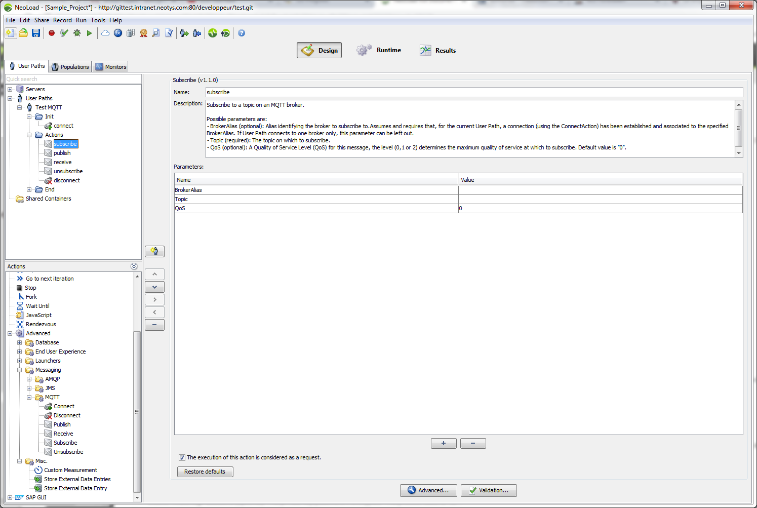An example subscribing to the ‘/neotys.com/share/news/’ topic with a default QoS value of "0" and using the connection associated to the ‘LocalDefaultBroker’ alias: