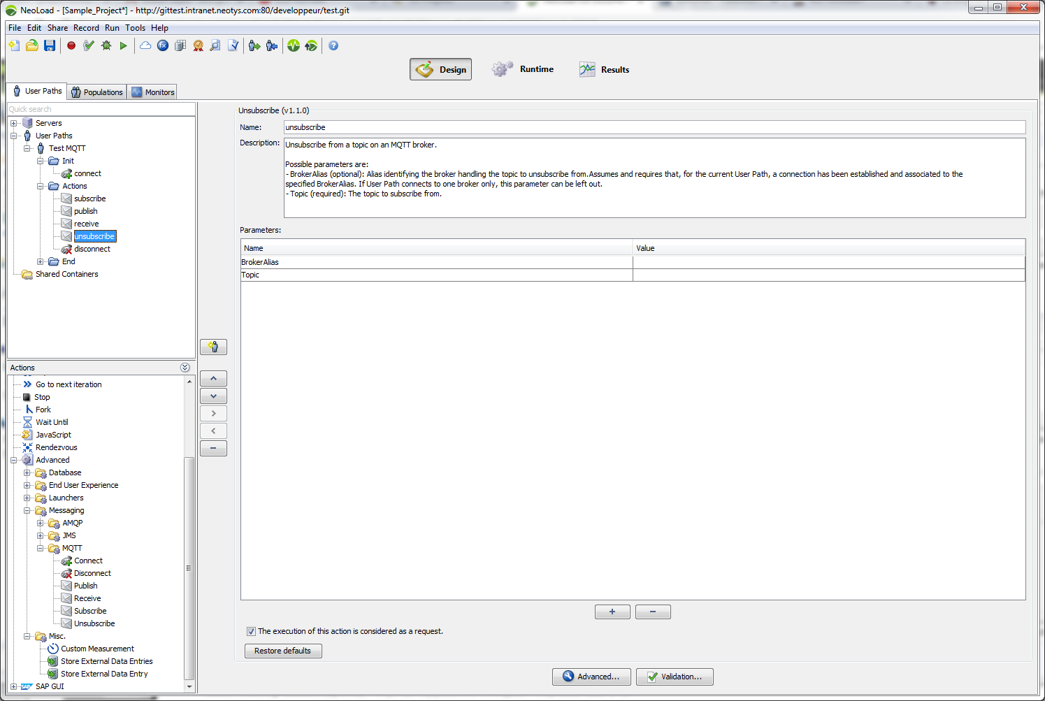 An example unsubscribing from the ‘/neotys.com/share/news/’ topic on the connection associated to the ‘LocalDefaultBroker’ alias.