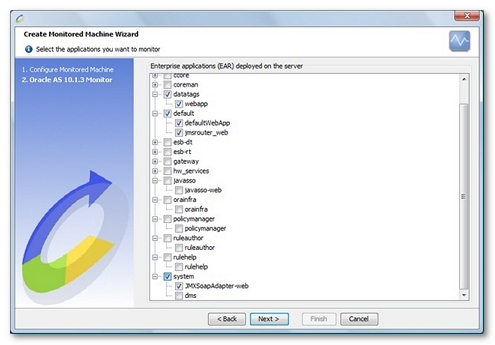 NeoLoad displays a list of the EARs (Enterprise Archive) and WARs (Web Application archive) deployed on the configured server. It then automatically selects the most appropriate counters for each of the selected applications.