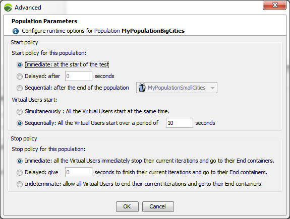 How Virtual Users start may also be defined: simultaneously or with a preset delay. This policy is used each time new Virtual Users are created, either at each load increase for a ramp-up load policy, at each load peak for a peak load policy, or each time a Virtual User is added manually during a test run.