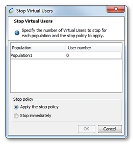 In User number, the number of Virtual Users to stop for the selected Population can be entered. Only the Virtual Users that are currently running can be stopped.