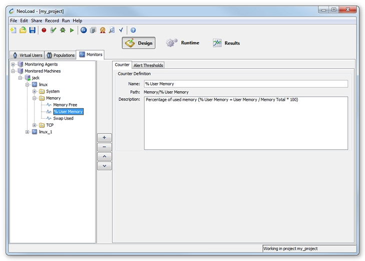 The Monitors tab displays the monitored machines in a tree view. Under each monitored machine, several monitors can be defined for each type of system being monitored. Several performance counters and indicators can be defined for each of these monitors. These counters (numeric values) and indicators (text values) are grouped by category. Several alert thresholds may be set for each performance counter above which an alert will be triggered during the test. By default, NeoLoad automatically selects the most relevant counters and indicators when the monitor is configured and sets the corresponding thresholds.
