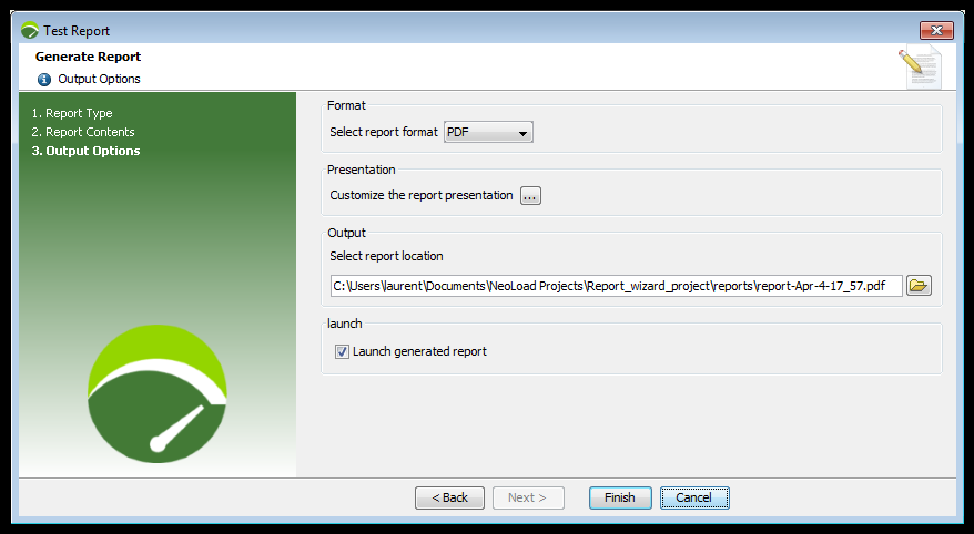When the Launch generated report option is selected, the generated report is opened automatically using the program associated with the report file extension (Windows only).