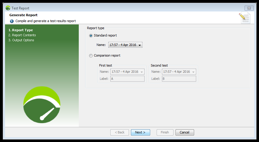 Comparison Report: A report that compares two sets of test results. Select the test results you want to compare in the drop-down lists. The Label field allows you specify the label to be used to identify the test in the report, in particular in the table column names.