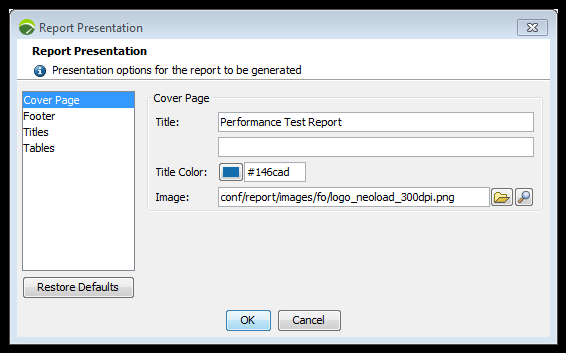 In the left tree view, a category to edit must be selected before modifying the corresponding colors or images. Only PDF and Word format reports have a cover page and footers. These items cannot be edited for an HTML format report HTML.