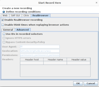 | Headers | Adds the specified headers that are sent with each browser request during the record. In the form of name=value, you can also specify a host to prevent those headers being sent to other servers. | String, String, String | |