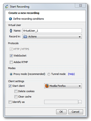 In NeoLoad, a click on the Start Recording toolbar button displays the Start Recording dialog.