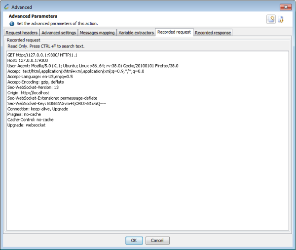 In the recorded WebSocket channel Advanced properties, the Recorded request tab shows the connection request.