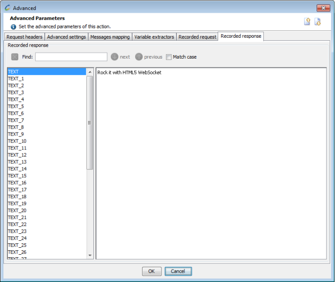 In the recorded WebSocket channel Advanced properties, the Recorded response tab shows the response recorded in the WebSocket.
