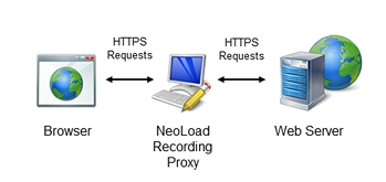 When recording a scenario, NeoLoad acts as a go-between with the browser and the web server. With a secure connection, NeoLoad has to decipher the traffic flowing between the two entities in order to analyze its content. Each time a communication is sent, NeoLoad decodes the incoming data, analyzes it, and re-ciphers it before sending it out again. This process requires the use of certificates.