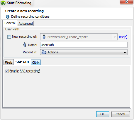 Enable SAP recording: The check box must be ticked to record an SAP GUI application. It is ticked by default after selecting the Start SAP recording in the Record menu.