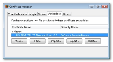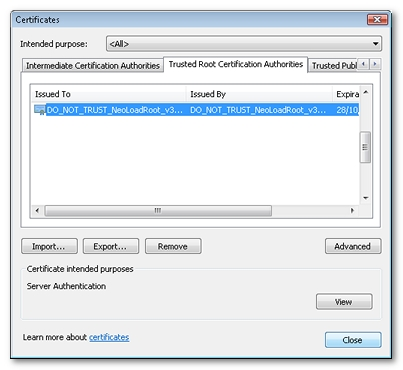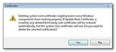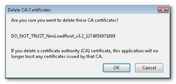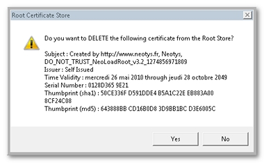 A window is displayed warning that deleting system root certificates might prevent some Windows components from working properly. The browser will display certificate errors when recording in NeoLoad using SSL, since the generated certificates will no longer be authenticated. Click Yes to continue.