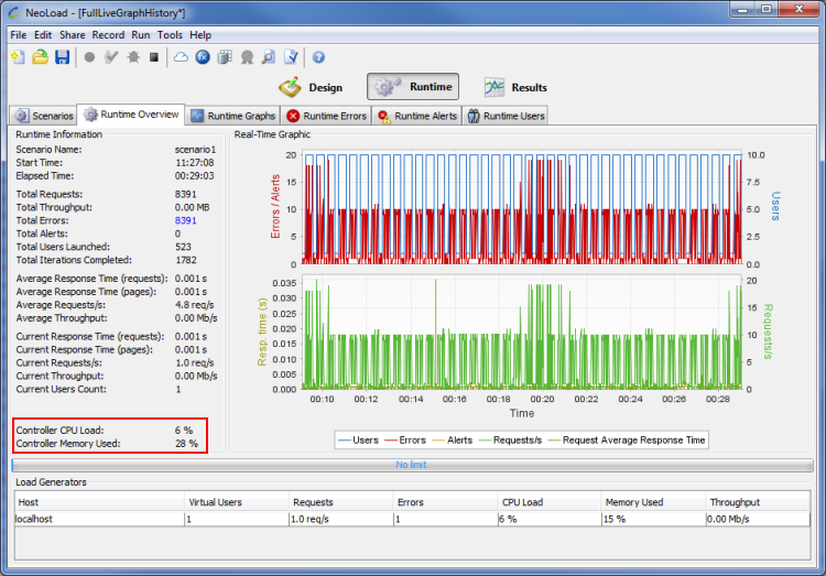 If the CPU Load or Memory Used figure regularly exceeds 90%, this indicates that the Load Generator is overloaded. Run the test with fewer Virtual Users or a longer think time, or use additional Load Generators.