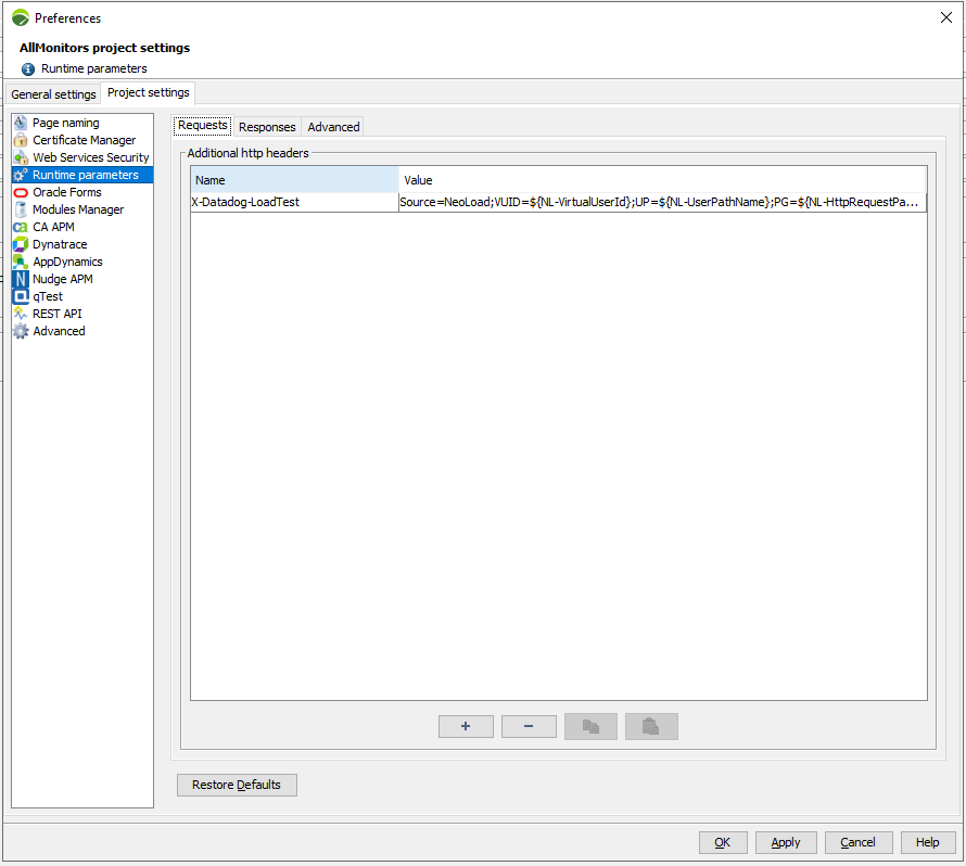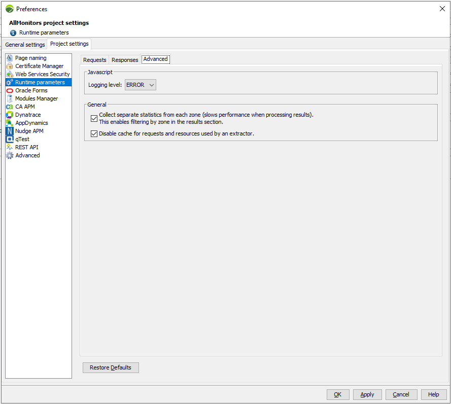 You can set the logging and error handling levels for NeoLoad in the Runtime parameters panel. Other settings related to runtime are also available.