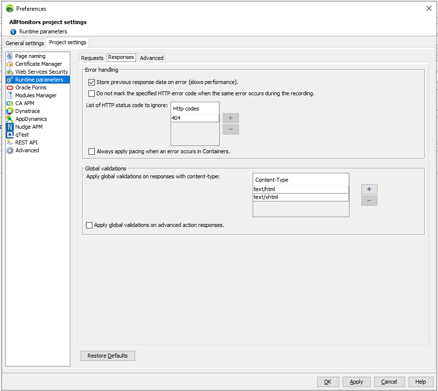 This is typically the case for missing resources (images, css, and so on) that send back a 404 Not Found error code. It is necessary to check the Do not mark the specified HTTP error code when the same error occurs during the recording box to ignore the errors with the 404 code if the recorded code was 404. Requests with a valid return code (200 OK) on recording are flagged as errors if a 404 error occurs at runtime.