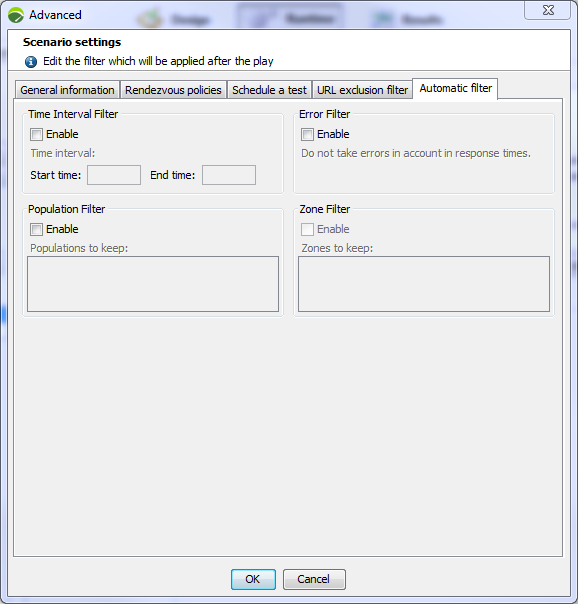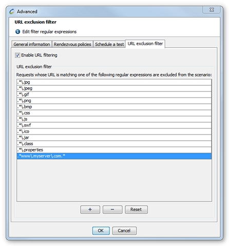 A filter can help exclude the requests whose URL corresponds to a file type or a portion of the application. For example, the filter .*www\.myserver\.com.* makes it possible to ignore all the requests sent to the server www.myserver.com from the test playback.