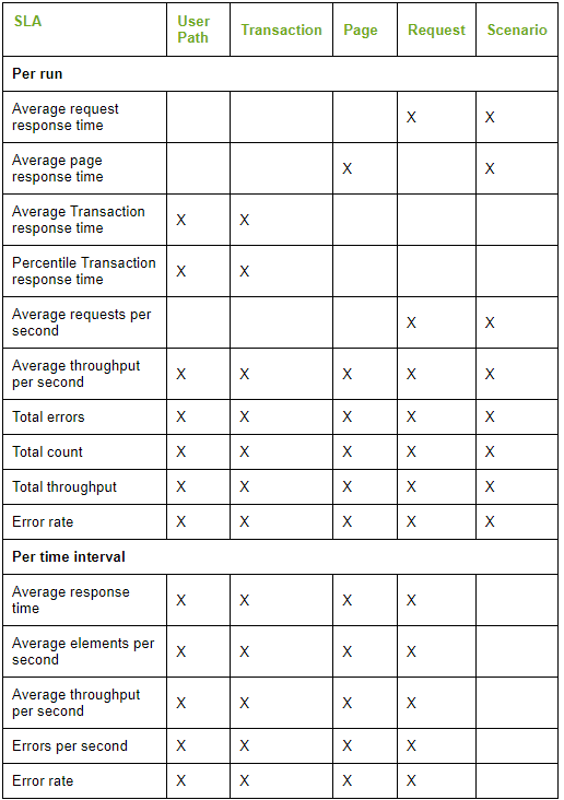 Per Run: These runtime-based SLAs are evaluated at the end of the test on: