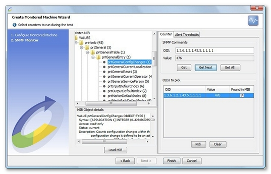 To choose the OID, an MIB may be loaded. A MIB is an information base containing all the OIDs defined for an SNMP component type. For example, router manufacturers such as Cisco provide MIBs containing the OIDs monitoring open or waiting connections.