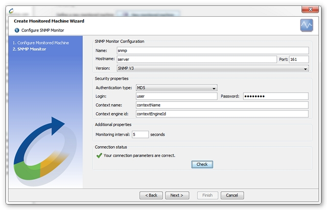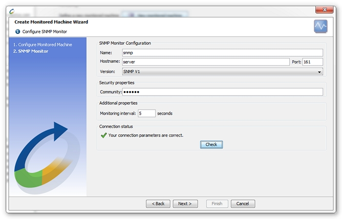 Defining an SNMP monitor requires the name or IP address of the machine to be monitored, as well as the connection port. The standard access port for SNMP parameters is port 161.