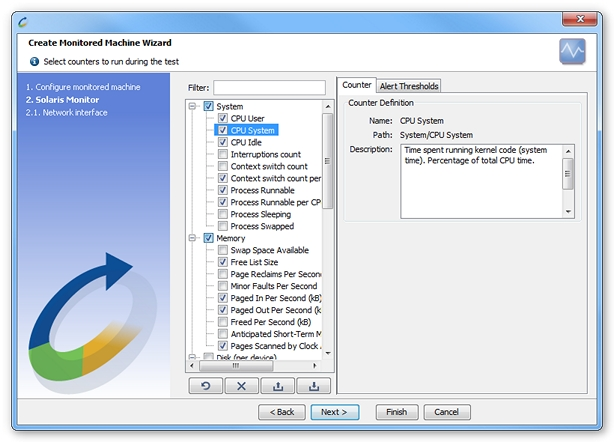 Network (per interface). The network section counters are available per interface. Outside the wizard, select the interface name in the counter definition pane. A network interface picker is available using the Populate button.