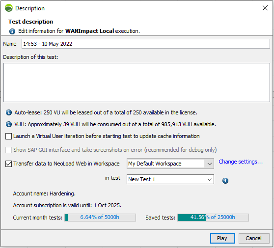 If the automatic lease of VUs is enabled, an information message specifies the number of VUs that will be leased over the test.