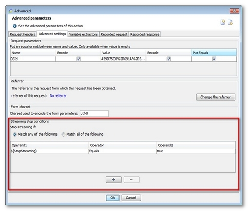 By default, a streaming request blocks the connection until the server closes the connection. You may also define the stop conditions for streaming. When the stop conditions are fulfilled, NeoLoad closes the streaming connection and moves on to the next action.
