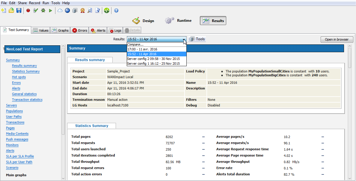 The Results section includes all the measures computed after a load test.