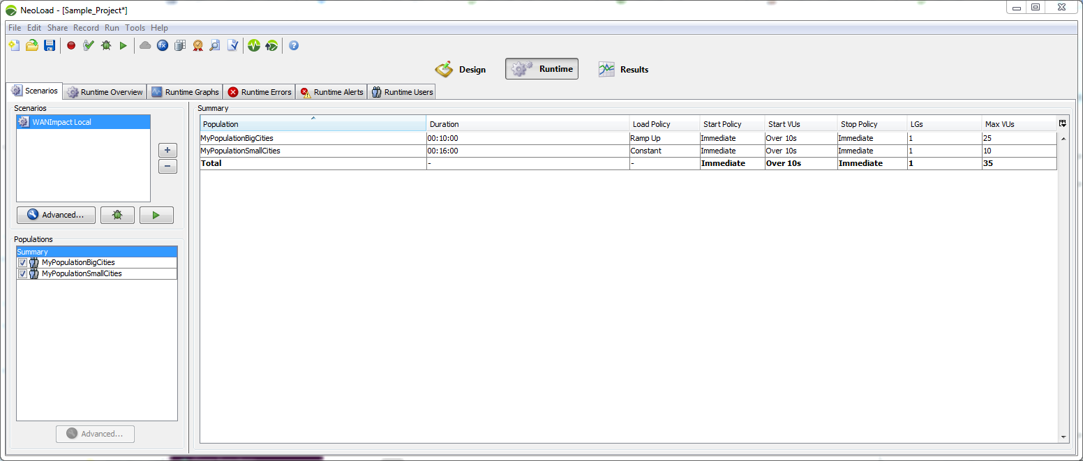 A scenario contains all the settings required to run a load test. The Populations to be executed during the scenario are defined first. Then, the following items may be configured for each of the selected Populations: