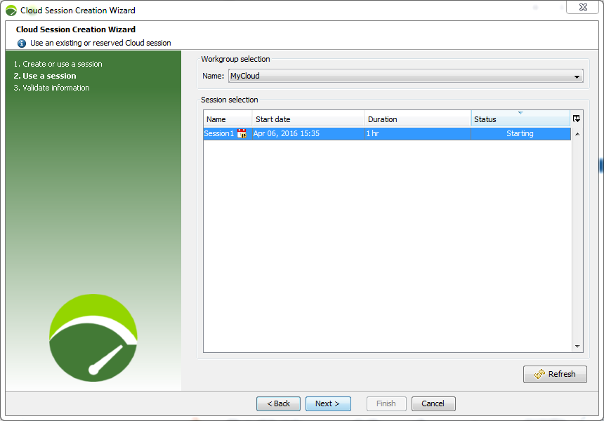 In the Cloud Session Creation Wizard, select Use a reserved Cloud session. Click Next.