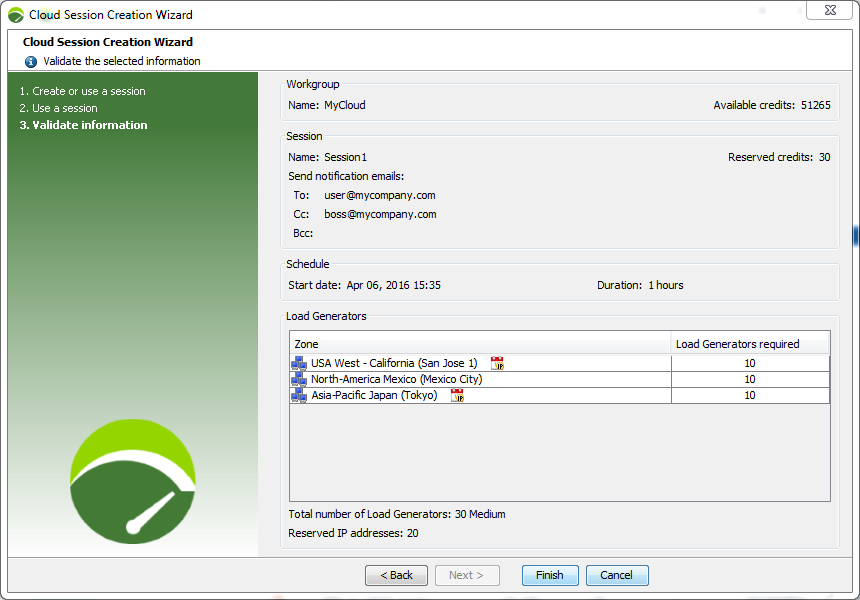 Reserving a Cloud session ensures the Load Generators are ready for a load test in the Cloud at a specific date. Besides, reserving the IP addresses of the Cloud Load Generators makes it possible to set the infrastructure before running the test.