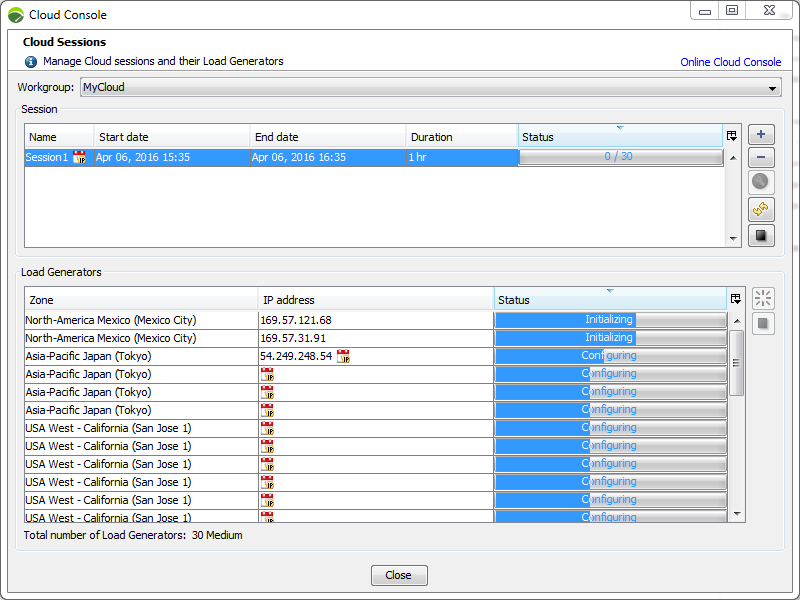 Once the Load Generators are started, the Cloud Console can be closed. For more information, see Manage Cloud Load Generators.