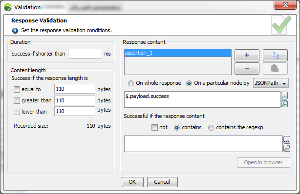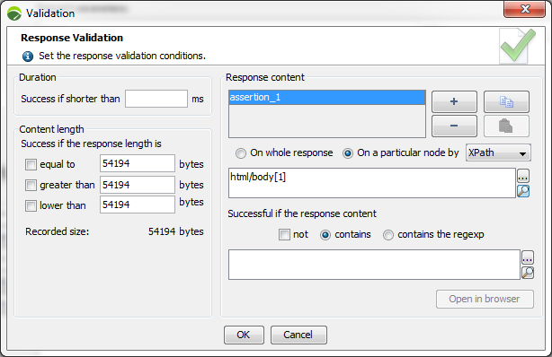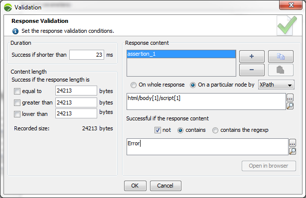 Allows adding assertions to the server responses to check their validity. The validity of the content returned by the server may be checked using the following criteria: delay, page size or page content.