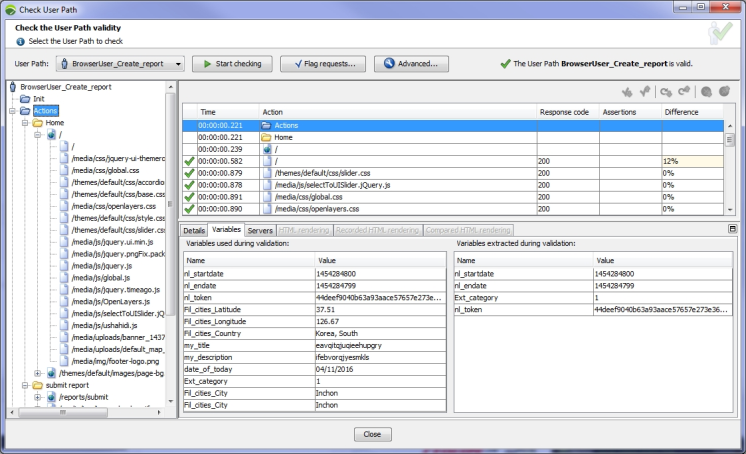 In the Check Virtual User dialog, the Variables tab displays the statistics of the variables used for the selected item in the tree view.