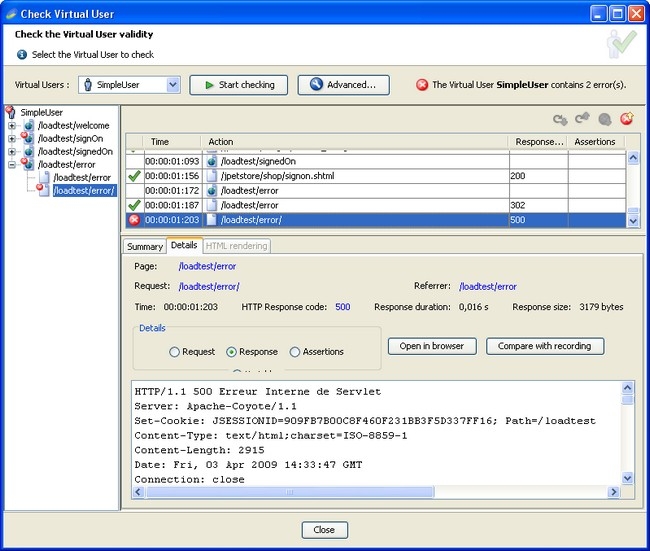 The Virtual User SimpleUser contains 2 error(s).An assertion validates a server response during a test by defining or asserting a condition that must be met. You will be shown in this section how essential assertions can prove to be.