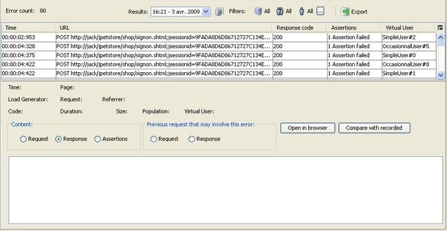 The Errors tab lists lines for HTTP requests only, contrary to the dialog box which presents a line for the HTML page a request belongs to. This is mainly because the Errors tab displays an error line for each type and each instance of a Virtual User played during the scenario.