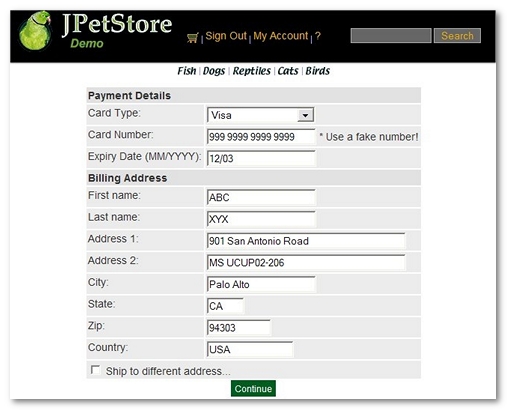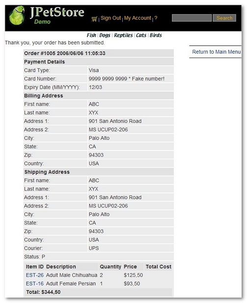 /jpetstore/shop/newOrderForm.shtml: contains the payment details and the billing address information, -