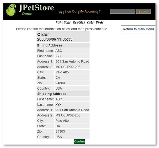 /jpetstore/shop/newOrder.shtml: sums up order information and prompts the user for the confirmation, -