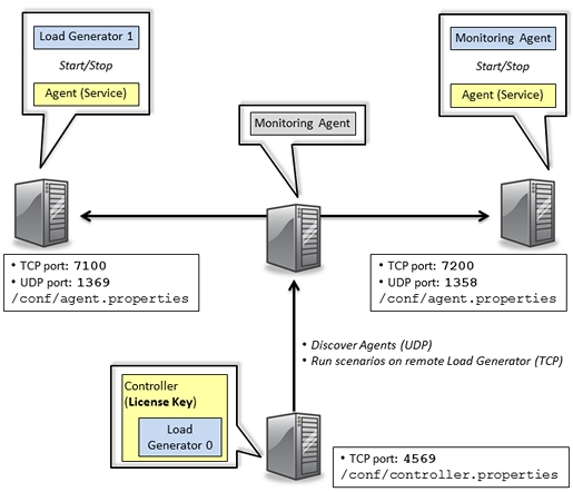 Since the Controller and Agent communicate with each other, any intervening firewall must be correctly configured. Three ports need to be opened: one for the Agent, one for the Load Generator, and one for the Controller. One UDP port must be defined for the Agent to allow the Controller to discover the Load Generators on the network. You may change all these default settings by editing the Controller or Agent configurations. For more information, see Use a firewall between the Controller and a Load Generator.