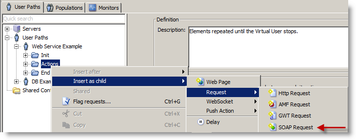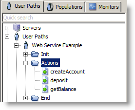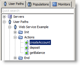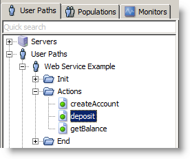 NeoLoad provides out of the box support for testing Web Services, the following example is a simple banking service. The first steps are to create a User Path and insert a SOAP request into the Actions section. For more information, see SOAP requests.