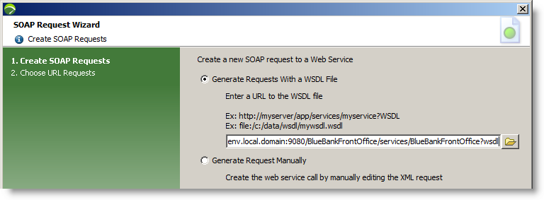 In the SOAP Request Wizard, we specify the path to the WSDL file of our banking service. This file contains the definition of the service including the available methods and required parameters.