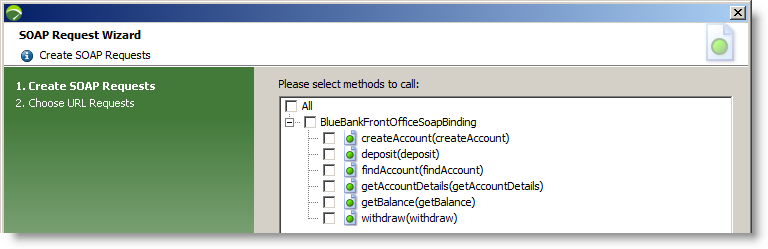 For the purpose of this example, we will pick a subset of the available methods. Namely creating the account, depositing some funds and checking the subsequent balance. The requests (or method calls) can either be added individually or added in bulk and the ones not being called, removed.