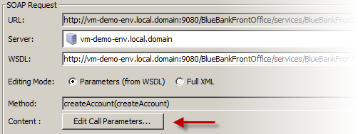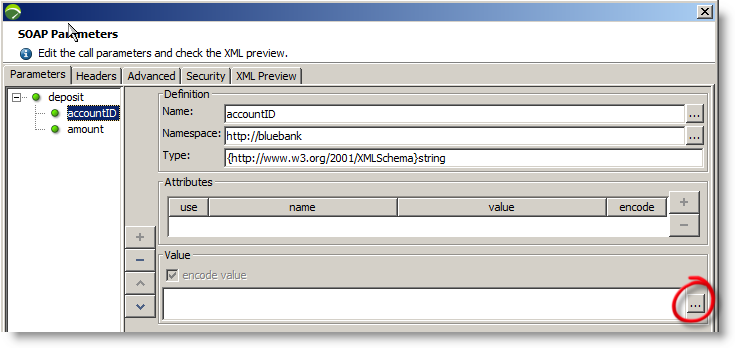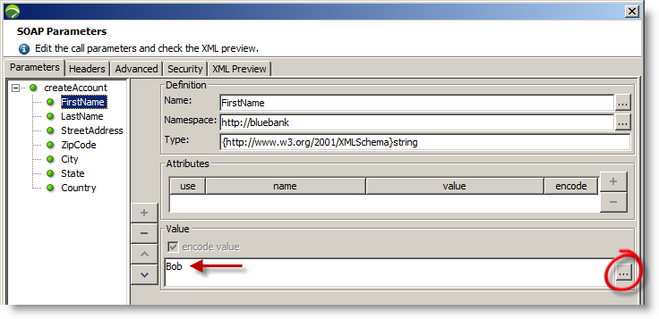 As this test was created by inspecting the banking services WSDL file, no data exists and needs to be entered manually, we provide the account holders details. These can be hard coded or read in from an external source such as a CSV file or database. The ellipse button (circled below) accesses NeoLoad Variable Manager.