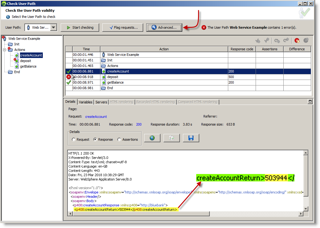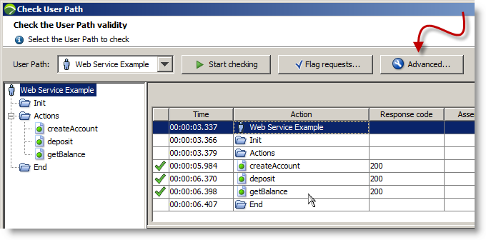 The final part of the exercise is to update our User Path with latest responses for the "deposit" and "getBalance" calls. We select the Advanced button in the Check User Path dialog and select Update.