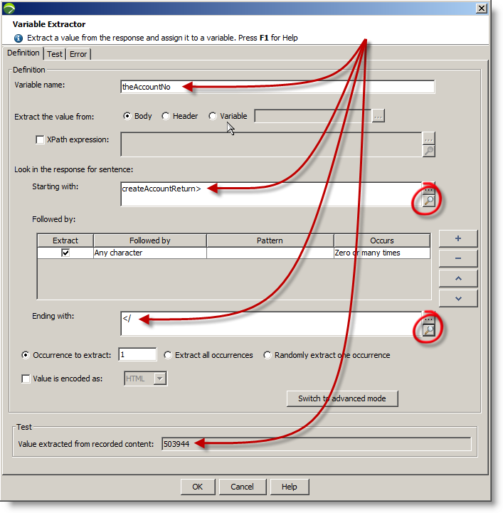 Entering the text before and after the account number allows NeoLoad to create a regular expression to extract the number itself (createAccount>503944</). These values can be entered manually or selected using the magnifying glass buttons. We name the variable "theAccountNo".