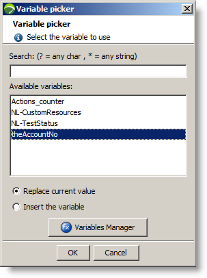 In the Variable picker list, we see "theAccountNo" variable we extracted from the "createAccount" response. We select it and click OK.