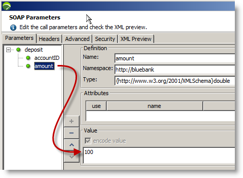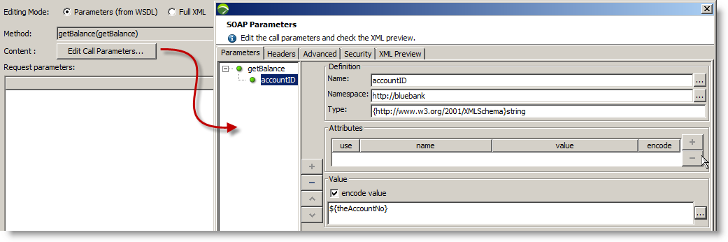 Exit the variable deposit method call, clicking OK as needed and select the "getBalance" request. Like the "deposit" request, we have to provide details of the account we need to access. We enter ${theAccountNo}.