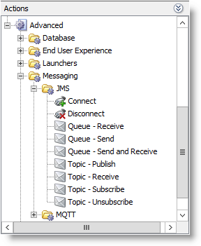 The last example in this guide is JMS. NeoLoad supports various queuing technologies such as ActiveMQ, Rabbit MQ and IBM MQ through the use of custom Actions and its JMS support. These options can be found in the Actions view in the NeoLoad Design perspective. For more information, see JMS.