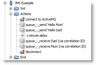The delay is included in this example purely to give enough time see the message on the queue before it is taken from the queue and received by the NeoLoad "receive" Actions.